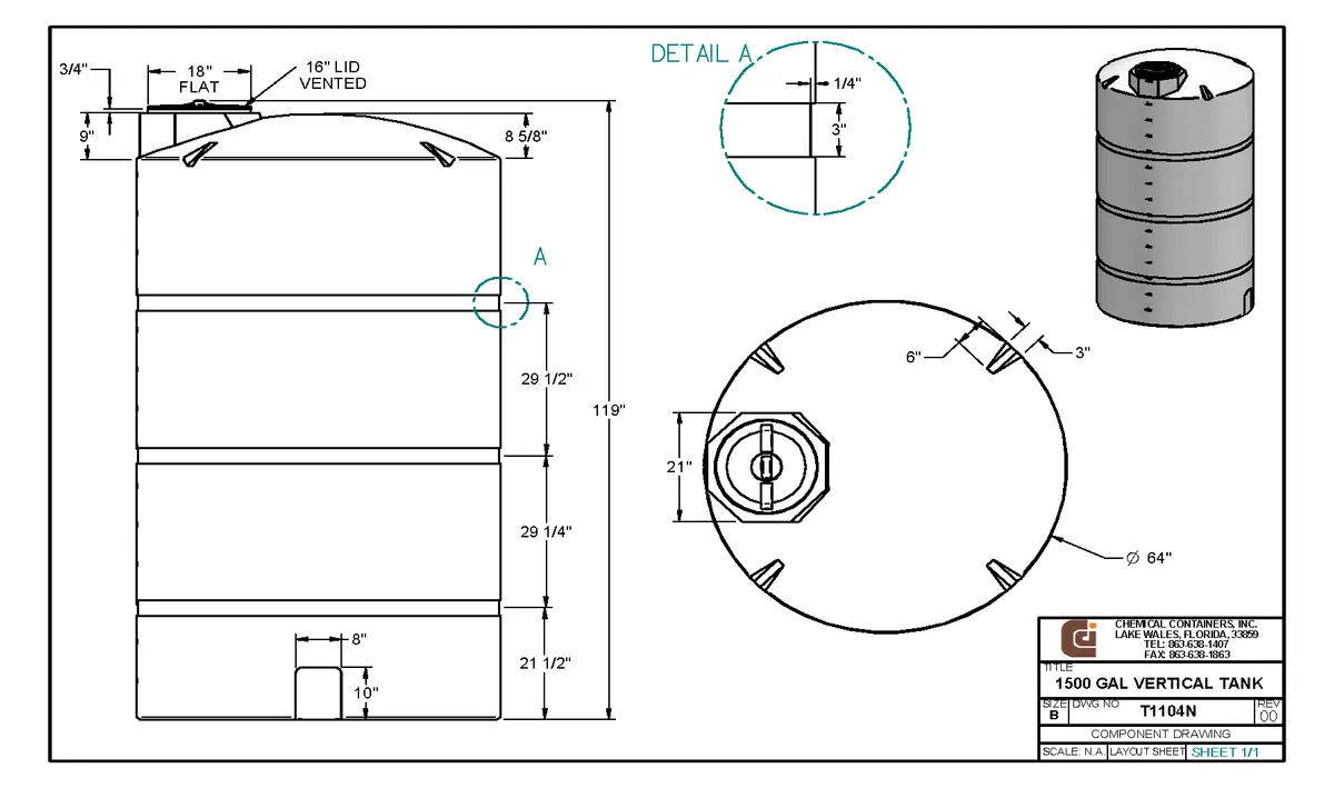 1500 Gallon Vertical Polyethylene Storage Tank - 64" D x 119" H