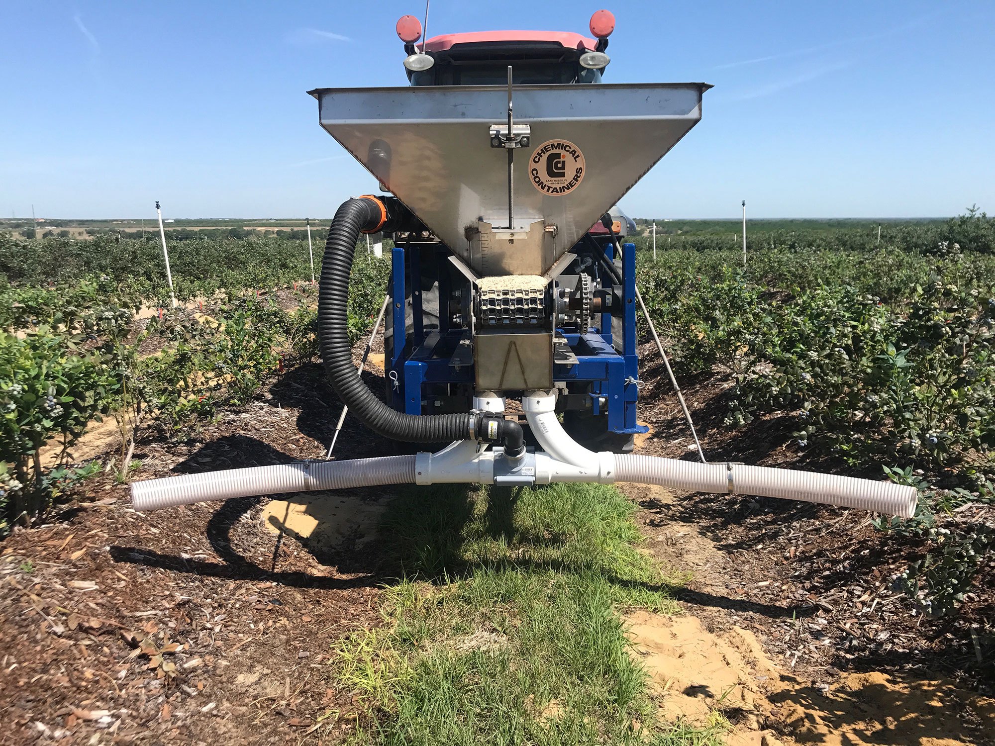This Stainless Steel 3-point Lift Dry Fertilizer Spreader from Chemical Containers is custom designed for row crop application especially blueberries.