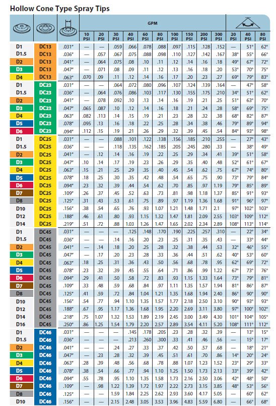 Spray pattern for Disc-Core TeeJet hollow cone spray nozzles These cores combine with orifice discs to create hollow cone spray tips. Choose from a variety of sizes and materials, keeping in mind you'll need an orifice disc and core that are made from the same material for proper assembly and performance. An example of a typical assembly with a disc core is: TeeJet Nozzle Body > 4514-NY Slotted Strainer > Core > Disc > CP20230 TeeJet Cap. If you don't see the exact disc core in this product line you're looking for, please give us a call at 1-800-346-7867, we'll be glad to help you.